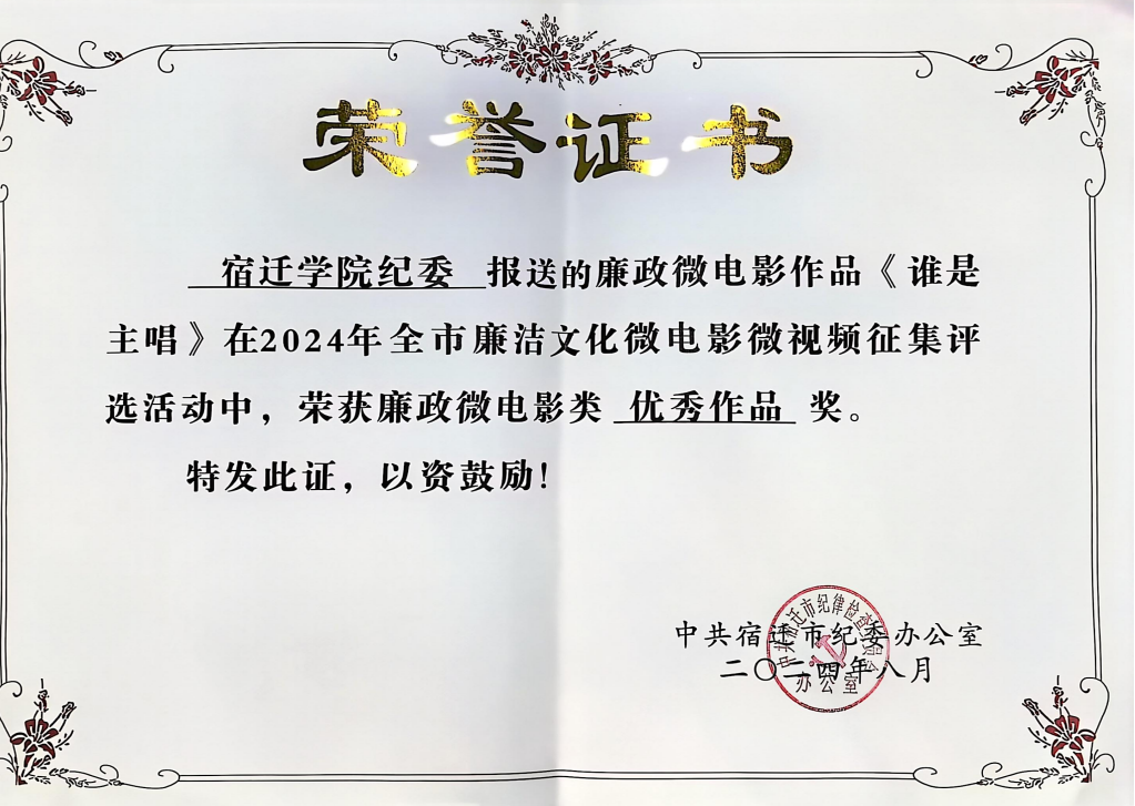 在全市多家部门单位选送的56件廉政微电影作品中,外国语学院党委创作的《谁是主唱》获得2024年宿迁市廉政微电影优秀作品奖。该微电影作品是由学生团队自编自导自演,演绎了主要学生干部在演唱会主唱人选选择时,不正确行使职权一事。剧情深刻警示了学生干部们要以身作则,自觉抵制不正之风,恪守纪律,严以律己,营造风清气正的良好学风。