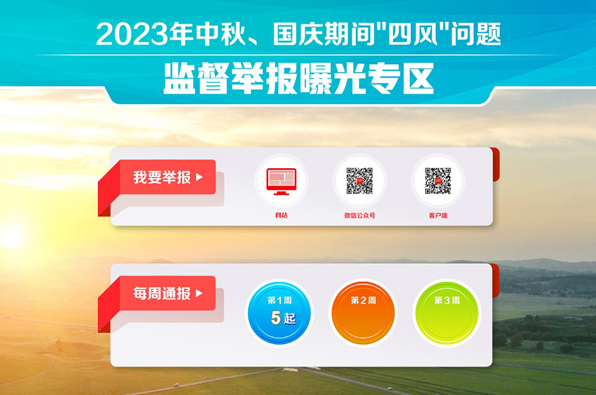 中秋、国庆节假将至,落实中央八项规定精神必须坚守节点、寸步不让。为持续强化正风肃纪,中央纪委国家监委网站推出“2023年中秋、国庆期间‘四风’问题监督举报曝光专区”,加大典型案例通报曝光力度,不断释放一抓到底、一刻不松的强烈信号。专区开设“我要举报”窗口,链接中央纪委国家监委统一举报平台,欢迎广大网友通过网站、手机客户端和微信公众号,对公款吃喝、在隐蔽场所违规接受宴请、违规收送礼品礼金、借操办婚丧喜庆之机敛财、公款旅游、公车私用等节日多发问题进行举报。专区“每周通报”栏目从9月22日起,分3次集中对典型问题点名道姓通报曝光,强化警示震慑。