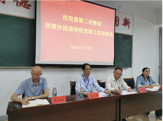 9月15日下午,校党委第二巡察组召开动员会。校党委常委、巡察组组长孙以泽就即将开展的巡察工作作动员讲话,外国语学院党委书记管志强主持会议,并代表外国语学院党委就贯彻落实巡察组要求、配合做好巡察工作作了表态发言。校党委第二巡察组全体成员,外国语学院班子成员,全体教职工参加会议。