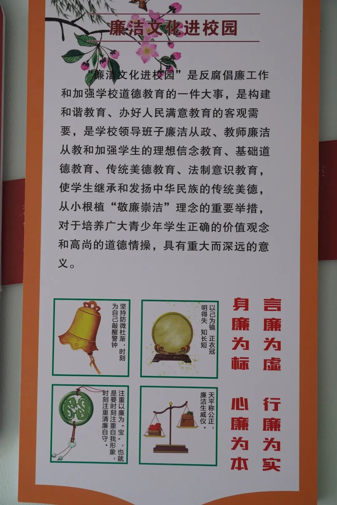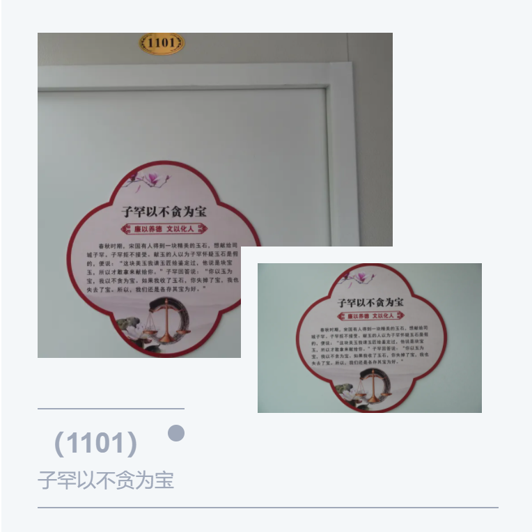 廉政文化长廊中每个办公室门上选取展出了“子罕以不贪为宝”、“丹心要学月月红”、“两袖清风的于谦”等十个古今清官的廉洁故事,故事短小精炼,寓意深远,旨在树立正面典型、弘扬中华优良传统和作风。